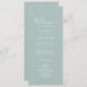 Dieses luftige und koordinierte Hochzeitsprogramm ist perfekt für eine Hochzeit. Das elegante und dennoch rustikale Design besticht durch helles Pastellgrün und ein modernes Boho-Ambiente. Koordiniert mit der Airy Greenery Collection von Fresh & Yummy Paperie. Geben Sie die Namen des Paares, das Datum und den Ort der Hochzeit, Dankeschön-Nachricht, Dienstorden, Hochzeitsfeier und ein optionales "in Loving Memory"-Denkmal ein.