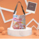 Cette pièce d'art originale colorée au Sac fourre-tout funky présente une patchwork funky style années 80 sur un arrière - plan abstrait coloré de bleu poussiéreux et d'orange mandarine avec rose, jaune et vert. Ce sac fourre-tout amusant et branché est plein de style artistique et peut être customisé avec votre nom! À utiliser et ré-utiliser pour faire vos courses avec du style.