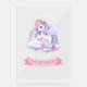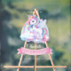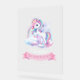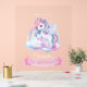 Akryllisches Zeichen zu einer magischen Geburtstagsparty mit einem bezaubernden Einhorn mit Flügeln in den Wolken auf einem Regenbogen Hintergrund.