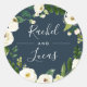 Siegel Sie Ihre Einladungen oder Favoriten mit diesen eleganten botanischen und blumengeschmückten Hochzeitsaufklebern mit Ihren Namen gerahmt durch einen Aquarellkranz mit üppigem grünem Blattwerk und weißen Blume auf einem reichen marineblauen Hintergrund. Koordiniert mit unserer Hochzeitskollektion Alabaster.