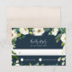 Diese neue, grüne und marineblau blaue RSVP-Karte, die sich mit unserer Hochzeitskollektion Alabaster abstimmt, besticht durch ein Spray aus Aquarellgrün und weißen Blumen, die Ihr Wunschtermin abrunden und den Wortlaut nach Maß akzeptieren und ablehnen.