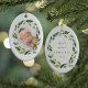Das süße Foto-Ornament besticht durch sein Foto, das von einem ovalen Kranz mit botanischem Blattwerk und weißen Blume gerahmt ist. Personalisieren Sie den Rücken mit Ihrer eigenen Beschriftung (mit "[name's] first Christmas" und dem Jahr gezeigt.