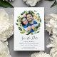 Unsere Save the Date Alabaster-Karte umrahmt Ihr Lieblings-Verlobung-Foto mit einem runden Kranz mit bemaltem Aquarellgrün und üppig weißen Blume. Personalisieren Sie mit Ihren Namen, Hochzeitstag, Ort und Hochzeitswebsite mit den angegebenen Feldern.