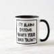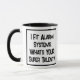 Ein lustiger Slogan auf einer Tasse, die sagt: "Ich fit Alarm Systems. Was ist IHR super Talent?" Zwei Tone-Tasse für einen Alarm-Installateur oder einen Sicherheitssystem-Installer. Schwarzweißtext.