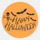 Dieser niedliche Kinderaufkleber ist mit einem hellen, orangefarbenen Hintergrund, einem niedlichen Skelett und schwarzen Fledermäusen ausgestattet. Es gibt einen schwarzen stilisierten Text, der lautet "HAPPY HALLOWEEN". Ideal zu Halloween.