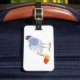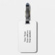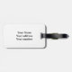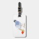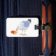Dieses Gepäckschild wird von einer albernen seetüchtigen Malerei geschmückt. Es macht ihm nichts aus, dass er damit beschäftigt ist, seine Pommes frites zu essen.