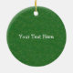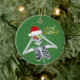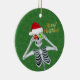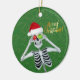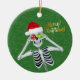 Dieses hängende Keramik-Ornament hat ein albernes Skelett, das rote und grüne Ornamente an seinen Augen hält, während er lächelt und einen aus Pelz getrimmten roten Weihnachtsmann trägt, der auf einem grünen Hintergrund mit Imitaten goldglänzenden Flecken aus Gold steht. Fröhlicher Weihnachtstext in Gold auf der Vorderseite. Passen Sie Ihren Text auf der Rückseite mit der Vorlage an.