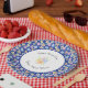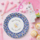 Schöne, kleine pastellfarbene Blume auf blauem Hintergrund mit individuellem Text