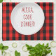 Alexa elektronische Apparatur Befehl zum Kochen des Abendessens auf weißer Tafel und roten und schwarzen Büffel karierte Muster.