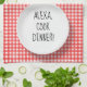 Alexa elektronische Apparatur Befehl zum Kochen des Abendessens auf der weißen Platte und rot-weiß verblassten Gingham Muster.