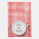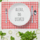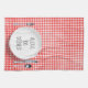 Alexa elektronische Vorrichtung zum Waschen von Geschirr auf weißer Tafel auf rotem und weißem Gingham-Muster.