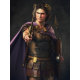 "Alexander der Große" - Eroberer des Empire. Eine stilisierte Darstellung von Alexander dem Großen. Ein junger Mann in seinen späten zwanziger Jahren mit durchdringenden blauen Augen, stehend selbstbewusst. Er hat langes, hellbraunes oder dunkelblondes, gewelltes Haar. Er trägt eine fein gearbeitete Bronzemuschel (Brustplatte), die mit aufwändigen Gravuren verziert ist und möglicherweise mythologische Szenen oder Symbole seiner Göttlichkeit enthält. Über seinen Schultern trägt er einen kurzen, fließenden lila Umhang (Chlamys), der mit einer goldenen Fibel an der rechten Schulter befestigt ist und das Königtum symbolisiert. In der einen Hand hält er einen Hoplon (Schild) und einen Speer und in der anderen eine stilisierte Darstellung seines Kopis (Schwert). Ein goldener Kranz umkreist seinen Kopf und symbolisiert seinen Anspruch auf göttliche Herkunft.