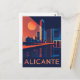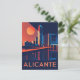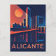 Eine lebendige und farbenfrohe Illustration der Skyline von Alicante bei Sonnenuntergang. Das Bild zeigt die berühmten Wolkenkratzer der Stadt und die Gebäude, die an einem feurigen orangefarbenen Himmel versilbert wurden. Das Wasser spiegelt die warmen Farbtöne des Sonnenuntergangs wider und schafft eine ruhige und faszinierende Szene.