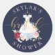 Eine schöne Alice im Wunderland Hochzeitsklebe Brautparty Sticker mit unserem eleganten, stilvollen und trendigen floralen Rose Garten blauen Alice im Wunderland Design. Das Design besticht durch ein handgemaltes, elegantes, blau-weißes Alice im Wunderland-Kleid mit einem botanischen Garten mit blühenden Rose und Blumen. Das blumengeschmückte Kleid hängt an einem verzierten, im Vintagen Stil gehaltenen Imitat mit goldenem Kleiderbügel. Weiche, funkelnde Verzierungen auf dem Hochzeitskleid schaffen einen schönen, eleganten und luxuriösen Look. Schöne Schrift-Stil Handschrift Typografie "Bridal" in Imitat Gold. Die goldfarbene Farbpalette aus Marineblau, Blassblau und Imitat verleiht dem Ganzen ein trendiges, Vintages Shabby Chic. Alle Illustrationen in diesem eleganten, blumengeschmückten Duschaufkleber sind handgezeichnet Originalkunstwerke von Moodthology. Ideal für Veranstaltungen zum Thema Alice im Wunderland.