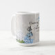 Eine schöne Vintage Alice im Wunderland in Schwarz und Weiß und ihr vertrautes blaues Kleid erscheint auf diesem lustigen und nostalgischen Design mit dem Zitat, "Neugierde und Neugierde! "Cried Alice", Vintage blaue Schmetterlinge und wunderschöne Vintage Hydrangeas in Blau und Weiß auf einem weich weißen rustikalen Holzboden, um eine schöne blumenliterarische Keramik Tasse. Matching Artikel und andere Alice im Wunderland und Alice "Neugierde" Artikel sind in meinem Zazzle-Shop erhältlich.