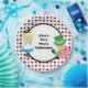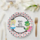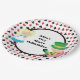 Niedliche Alice im Wunderland Thema Geburtstagsparty Teller. Das kleine Mädchen Alice in ihrem blauen Kleid und der Mad Hatter sitzen auf einem Kartenmuster in Rot und Schwarz mit Pik- und Diamantsymbolen. Passen Sie Ihren eigenen Text an.