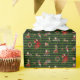 Zu den Mustern gehören Alice, Königin des Herzens, Mad Hatter, White Rabbit, Cheshire Cat, Humpty Dumpty, Schlitten, Heilige, Kranz, Teetasse und Kerze auf grünem und schwarzem Harlequin-Hintergrund.