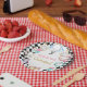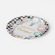 Sweet Alice im Wunderland Thema Geburtstagsparty-Platte mit verschiedenen Gegenständen aus der Geschichte auf einem schwarzen diamantförmigen Muster Hintergrund. Das Imitat goldfarbenes onederland Textimage befindet sich auf einer separaten Ebene und kann entfernt werden.