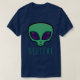 Cartoon Alien Kopfbild mit großen dunklen Augen mit "Glaube" Schrift.