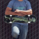 Dd Marke Skateboard, mit grafischen Kunstwerken einer grünen Alien mit farbigen Galaxie-Sonnenbrillen, vor einem abstrakten Hintergrund.