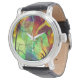 Alien feuert Opal abstrakt auf dieser Uhr. Alien wie die Ansicht von Scheiben aus lackiertem Glas in Wirbel von Farben, die an Feueropal erinnern, lebendig blau, grün, gelb, rot, orange und lila