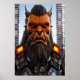 Un alien orange avec cheveux noirs et barbe en ville. C'est un art généré par l'IA.