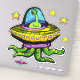 Dieser super niedliche Alien Aufkleber hat eine fröhlich lächelnde grüne Alien, die aus einem Neo schaut, während er durch die Sterne schwebt, im Weltraum. Tentakel knacken aus der fliegenden Untertasse. Diese originale Kunst wurde mit Kugelgelstift handgezeichnet, dann digital gefärbt.