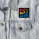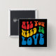 Machen Sie Liebe, hat nicht Krieg… dieser Vintagblick Knopf einen groovy Schriftart und groovy Farben mit gewelltem Text auf einem schwarzen Hintergrund.