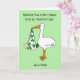 Eine einfache Illustration eines riesigen weißen Storches, der ein Baby in einer mit Kleeblattmuster bedruckten Decke hält. Das Bild ist vor einem hellgrünen Hintergrund gesetzt und wird von den Worten 'Wir wünschen dir einen sehr glücklichen ersten St. Patrick's Day als Mama' begleitet.