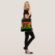 Schwarze Tasche, vorne und hinten bedruckt mit Silhouette Palmen und der Text IRIE über einen rasta farbenen Sonnenuntergang