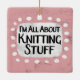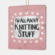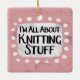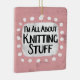 "I'm All About Knitting Stuff" ist ein niedliches Textdesign in Rosa mit schwarzem und rotem Text, zusammen mit einer weißen Akzent-Form und weißen texturierten weißen, weißgetönten weißen Punkten, die ihn umgeben.