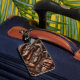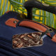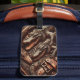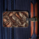 Nahes Aufsetzen von kunstvoll geschnitzten Alligatorenköpfen und Schwänzen auf Lederoberflächen mit Gürtelschnalle und detaillierten Blumenmustern.