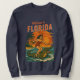 Diese kitschige Retro-Strandkunst ist 'nur in Florida'-Energie! Eine wilde Pin-up-Dame fängt eine Welle, während sie auf einem Alligator wie auf einem Surfbrett reitet. Die Szene am Strand bei Sonnenuntergang hat kräftige orange und rote Farben, komplett mit Palmen, die im tropischen Wind wehen. Fügen Sie Ihrem Outfit ein bisschen Floridas Chaos hinzu mit diesem lustigen Sweatshirt. | Lebendige Drucke werden für nicht-weiße Kleidungsstücke empfohlen.