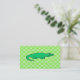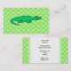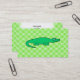 Ein Cartoon eines freundlichen schauenden Alligators. Auf einem hellgrünen gemusterten Hintergrund.