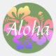 Grüner Hintergrund, Regenbogen-Hibiskus-Blume und "Aloha"-Text in weißem, modernem Schriftart ist der perfekte Gruß!