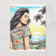 Eine wunderbare Einladung, mit einem lächelnden Mädchen, in eine verträumte, farbenfrohe und helle Natur einzutreten. Ein Fenster auf eine wunderbare Landschaft.