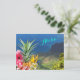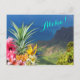 Hawaii Postkarte mit "Aloha" Text und tropischen Blume und Ananas. Die Fotografie zeigt das gebirgige Terrain entlang des Ozeans und ist ein schöner Hintergrund für die bunten Früchte und Blume.