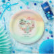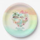 Tropische Teller aus hawaiianischem Party in Pastellfarben mit tropischen Herzen mit Blick auf den Strand, Flamingos und Blume mit regenbogenfarbenem Hintergrund. Personalisieren Sie den Text einfach. Kate Eden Art
