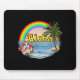 " Aloha" auf einem Sonnenunterganghintergrund, umgeben durch Blumen, Palmen, Regenbogen und Ozean
