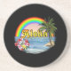 Wort "Aloha" auf einem Sonnenuntergang, umgeben von Blume, Palmen, Regenbogen und Ozean