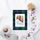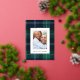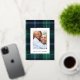 Envoyez des salutations de saison avec cette carte de voeux photo encadrée "Happy Holidays" en papier plaid bleu, blanc et vert. Les "Joyeuses Fêtes" peuvent être remplacées par "Joyeux Noël", "Bonnes Fêtes", etc. Les options pour la feuille sont l'or, l'argent et l'or rose.