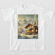 Alpine inspirierte Winterlandschaft mit gemütlichem Chalet umgeben von schneebedeckten Bäumen und majestätischen Bergen. Ideal für rustikale Dekoration, saisonale Kunst und Urlaubsstiftung!
