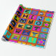 Weihnachtsverpackung, farbenfrohe Geschenkpackung, Geburtstagsverpackungspapier, rot-blau-gelb, orange-grün, Stammeskunst, ethnische Volkskunst, Alphabet-Volkskunst, zeitgenössisches Packpapier, Virginia Vivier, Vagabond Folk Art, Geschenkverpackung.