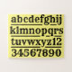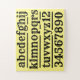 Kinderpädagogik. Ein Geschenk für ein Kind, das ihnen beim Spielen beim Lernen hilft. Dieses Puzzle hat ein Design, das sowohl das Alphabet als auch Zahlen enthält. Ihr Kind wird lernen, wie es ihnen Spaß macht, das Puzzle zusammen zu setzen. Jigsaw mit großen Stücken. Ein Design mit dem Alphabet und den schwarzen Zahlen auf einem gelben Hintergrund. Das ist eine gute Lehrhilfe für jeden, der in der Bildung arbeitet.