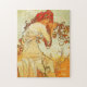 Alphonse Mucha Sommerpuzzle. Ölmalerei auf Leinwand aus dem Jahre 1896. Während seiner gesamten Karriere malte der tschechische Künstler Alphonse Mucha häufig allegorische Abbildungen der Jahreszeiten. Der Sommer 1896 ist aus einem kompletten Vierjahreszeitalter Set und hat eine schöne junge Frau mit hellbraunem Haar, die sich auf einer Weinrebe am Flussufer anlehnt, während sie sich ins Wasser taucht. Sie trägt ein dünnes, weißes und große rote Blume im Haar. Ein wunderschönes Geschenk für die Fans von Alphonse Mucha, Jugendstil und Vintage Drucke.