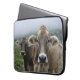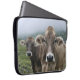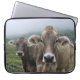 Ein Foto einer grauen braunen alpinen braunvieh Kuh mit den flaumigen Ohren in Österreich, gegen einen Hintergrund der nebelhaften Berge.