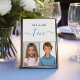 Eine moderne, originellere Art, Ihre Tischnummern mit Fotos von Braut und Bräutigam in der Kindheit zu personalisieren (die Standardeinstellung ist zehn). Die Fotos eines kleinen Mädchens (der Braut) und eines kleinen Jungen (des Bräutigams) sind in schwarzen Rahmen, in der unteren Hälfte. Im oberen Teil gibt es die Nachricht "als wir zehn waren" mit dem Alter geschrieben in einem blauen Handschrift und die Erholung oben, in kleineren schwarzen Kappen (Handbuchstaben). Die Platzhalter-Fotos von zwei Kindern, einem Jungen und einem Mädchen, sind nicht real, sie sind KI generiert.
