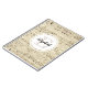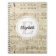 Alte Vintage Noten in schwarzer Tinte auf einem antiken beigen Pergament mit Noten. Erinnerungen von vor langer Zeit, als Musik handschriftlich in Tinte geschrieben wurde. Ein Kreis, der oben mit Ihrem Namen und dem Monogramm-Anfangsbuchstaben angeordnet ist.