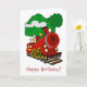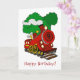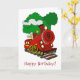 Ein niedlicher Cartoon-Zug mit der Nummer 9 vorne und Rauch aus dem Stack und Bäumen im Hintergrund.