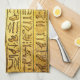 Ein Set gelber Küchentücher mit antiken Hieroglyphen, die auf Stein graviert sind.